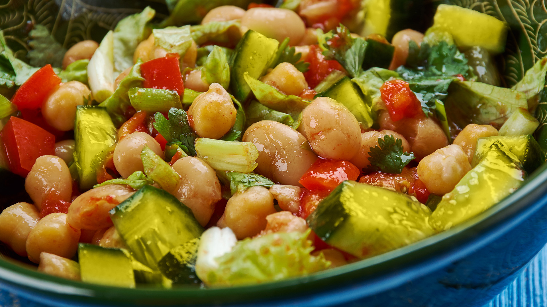 1. Se amestecă ingredientele într-un bol: năutul boabe (scurs), ardeii copți tăiați mărunt, castraveții cornișon tăiați mărunt, porumbul dulce, ceapa verde, mărarul și pătrunjelul.